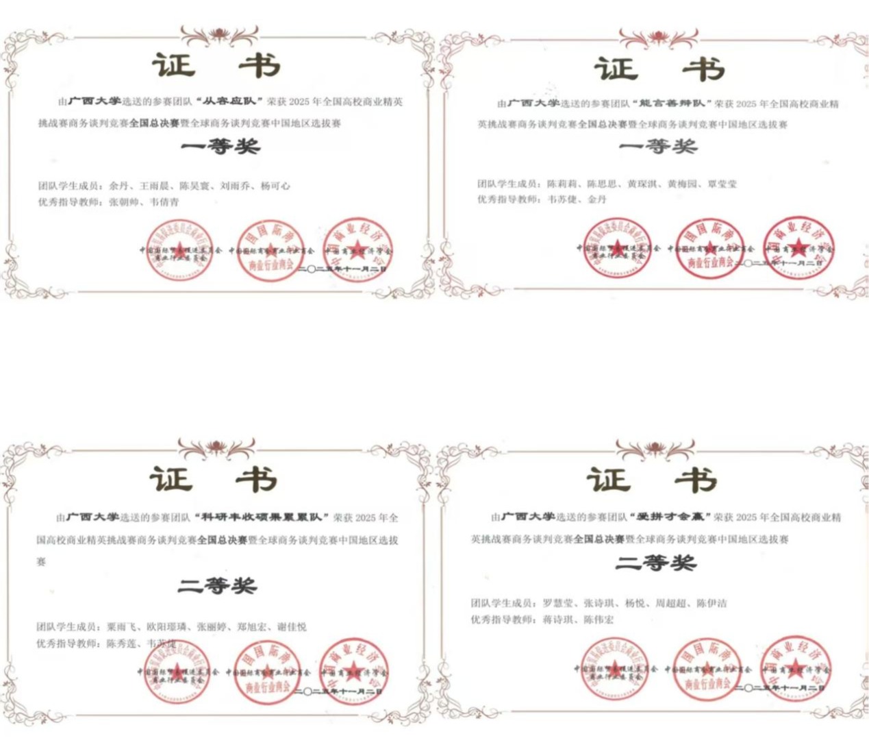 近日,2025年全国高校商业精英挑战赛商务谈判竞赛全国总决赛圆满落幕,我院代表队经过知识考核、方案撰写、线上谈判多环节比拼,凭借扎实专业功底与出色的临场表现,从全国 500 支队伍中脱颖而出,斩获全国一等奖 2 项、二等奖 2 项。