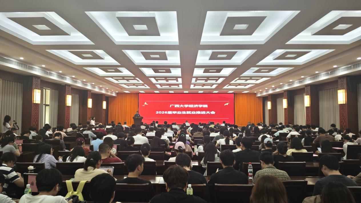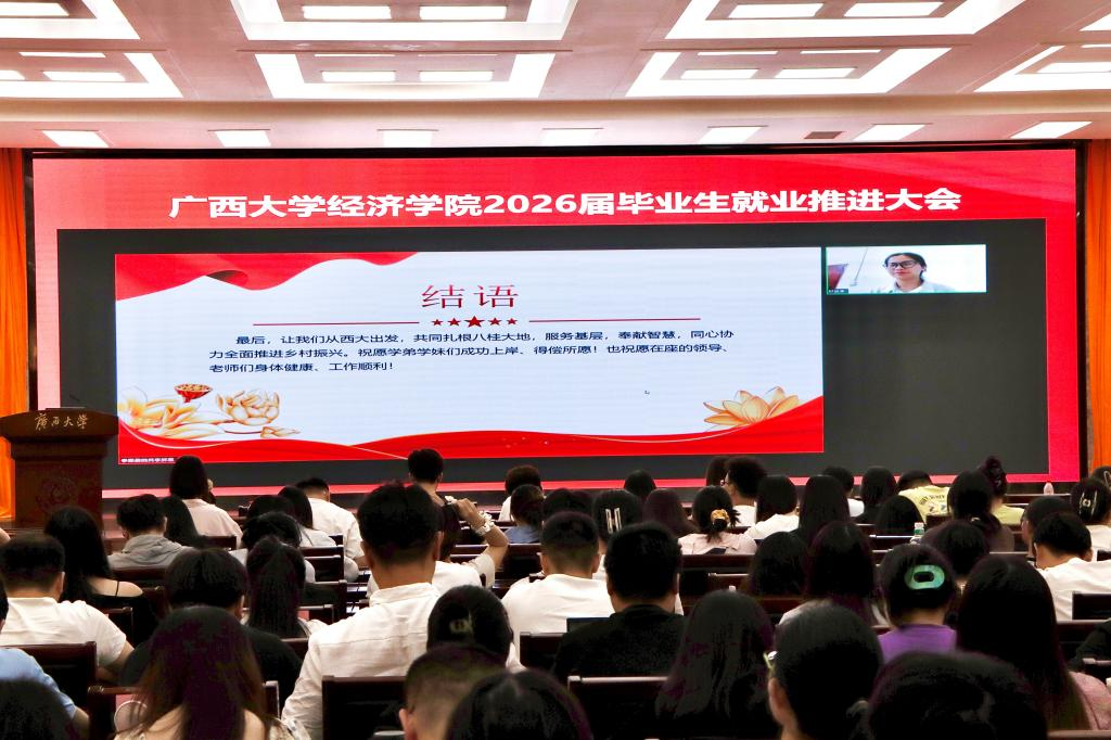 2025年10月13日,广西大学中国—东盟经济学院/经济学院/中国—东盟金融合作学院在君武楼玉林厅召开2026届毕业生就业推进大会,学院党委常务副书记姜玮、党委副书记刘梦娟、校学工部(处)武装部陈榕平、院团委书记王海希、各系主任、毕业班班主任、全体辅导员、优秀校友代表、2026届全体毕业生出席。会议由辅导员于娜主持。