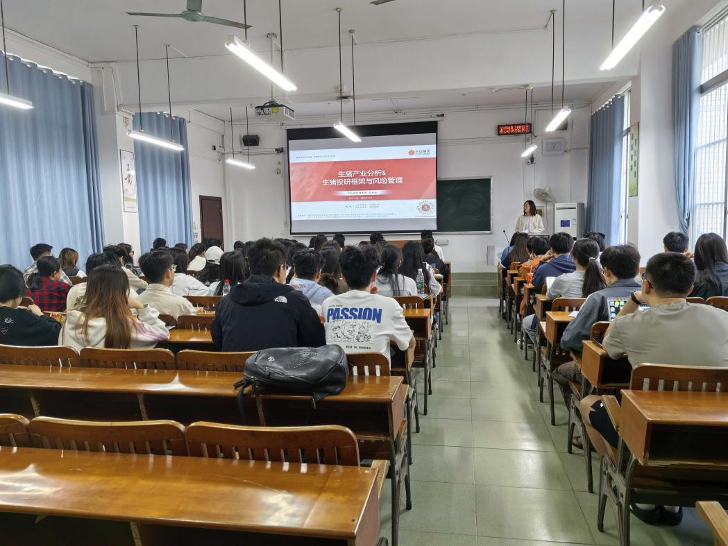 2025年10月28日上午,中信期货研究所高级研究员程也受邀到访广西大学经济学院,在第三教学楼405教室为全体25级金融专硕同学作主题为“生猪产业投研分析与风险管理”的专题讲座。