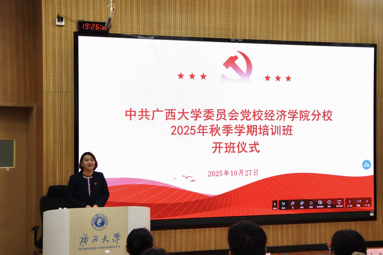 2025年10月27日,中共广西大学委员会党校经济学院分校第九期入党积极分子培训班开班仪式在东10A-305教室隆重举行。学院党委常务副书记姜玮、党委副书记刘梦娟、团委书记王海希和老师代表与全体学员共同出席。仪式由刘梦娟副书记主持。