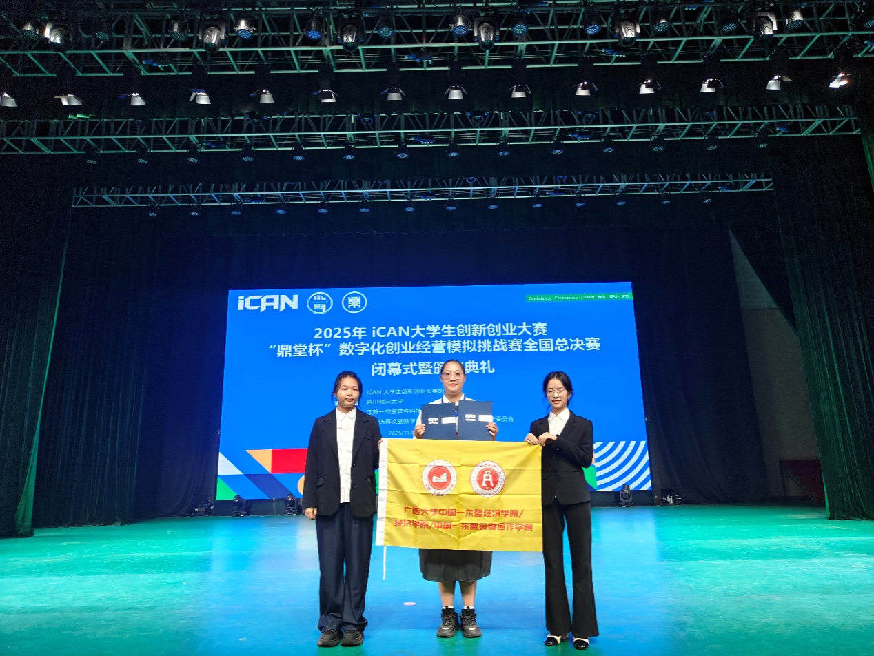 近日,2025年iCAN大学生创新创业大赛“鼎堂杯”数字化创业经营模拟挑战赛全国总决赛在四川师范大学圆满落幕。经过校赛、省赛、全国初赛的层层筛选与激烈角逐,由我院2023级本科生黄雅婷以及工商管理学院本科生李婷、黄小雨组成的“创业小天才队”成功晋级全国总决赛,并从全国137支晋级队伍中脱颖而出,最终斩获全国一等奖。同时,指导教师陈伟宏副教授荣获“优秀指导教师奖”。