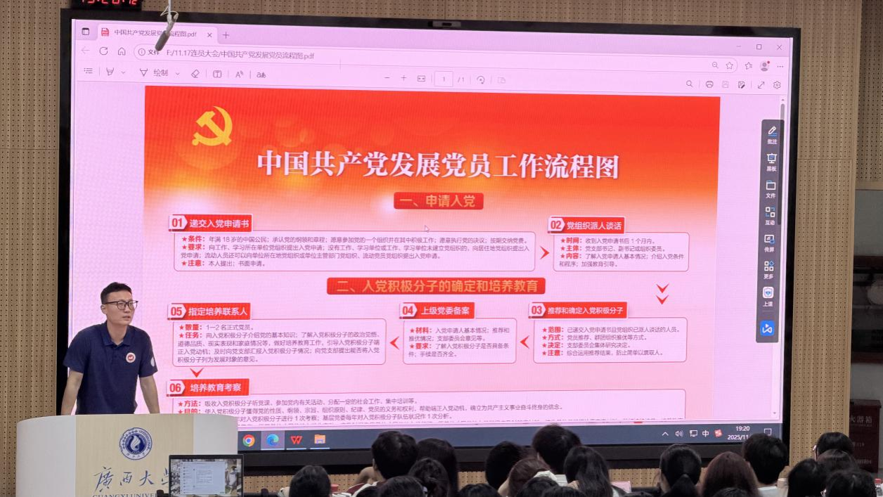 接着,指导老师郭霖刚系统介绍了学生党员发展全流程,并针对各环节的申报条件、材料规范要求及注意事项进行逐一说明。