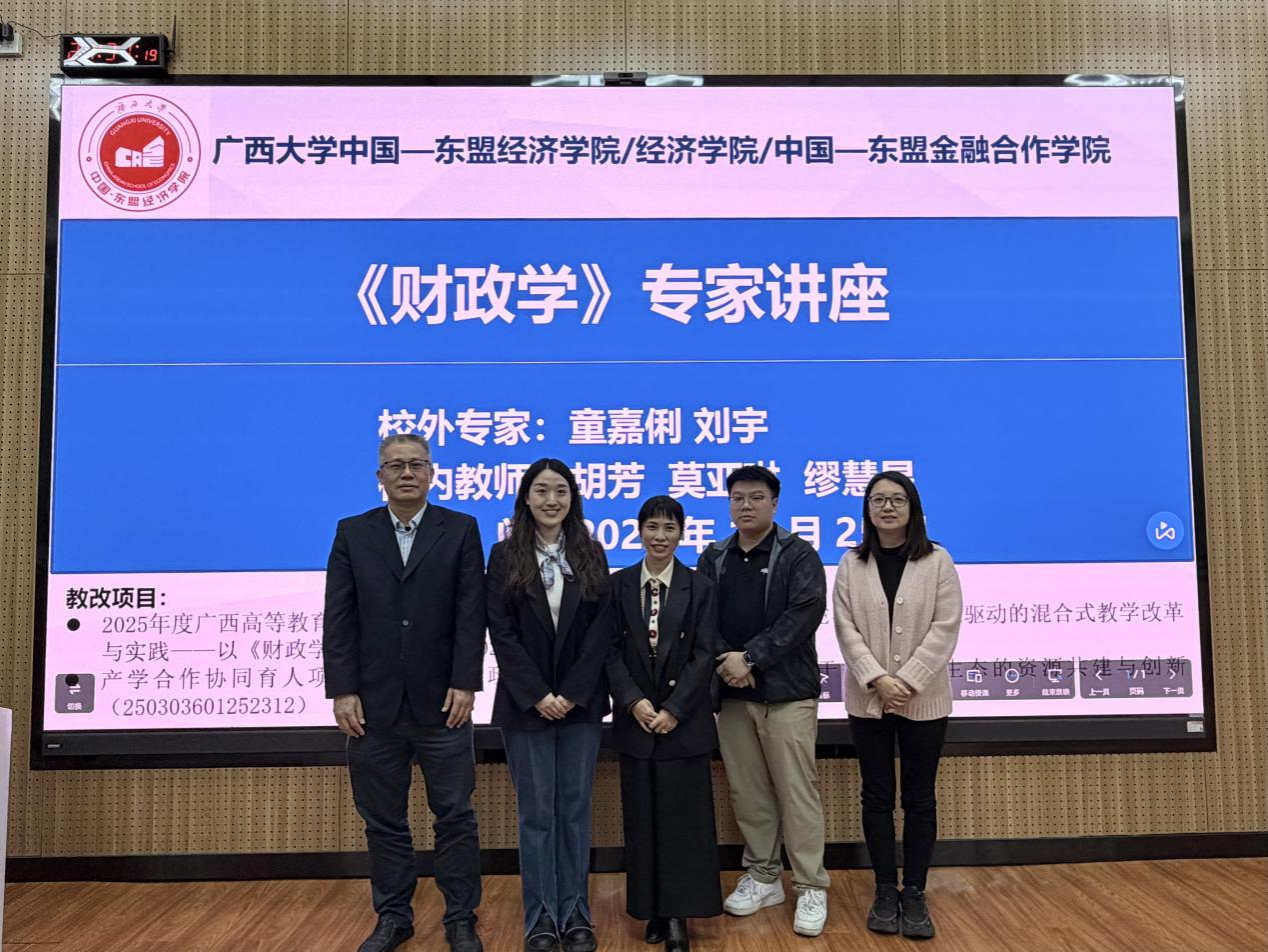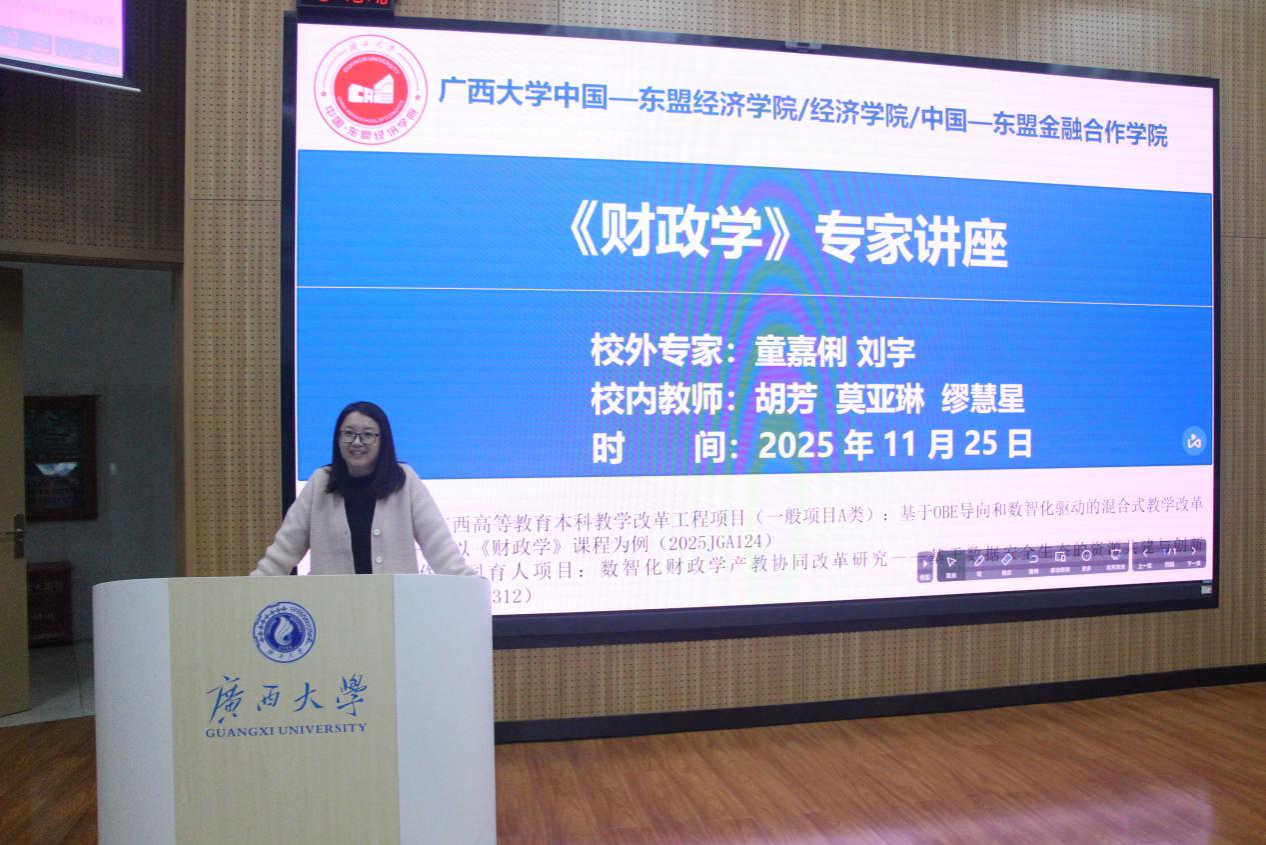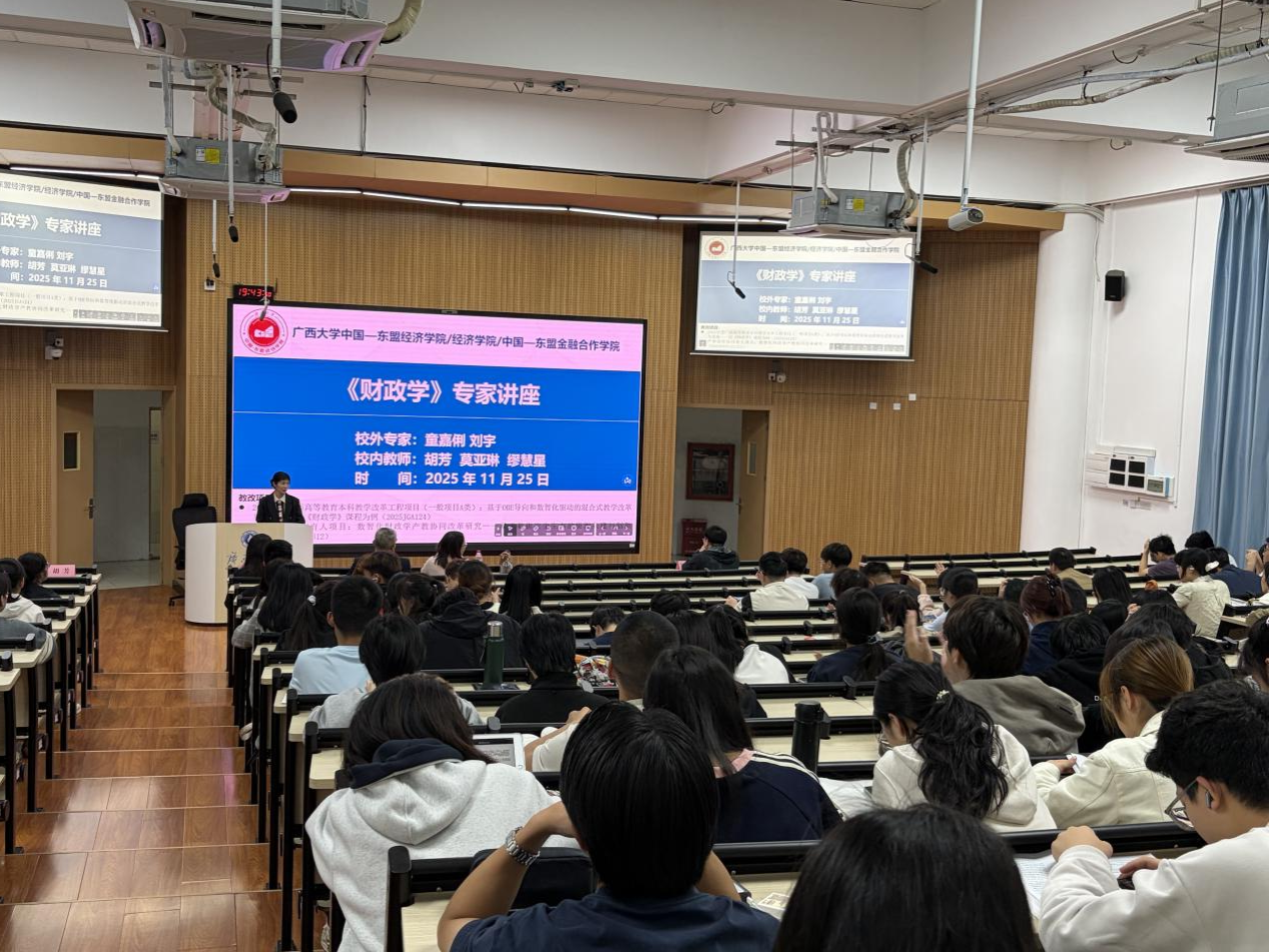 为深化本科生教育教学改革,促进学院各本科专业更好地实现协同育人培养目标,使本科生将课堂所学与实践相结合、提高运用知识的综合能力,2025年11月25日晚,学院在东10A-305智慧教室举办了《财政学》专家讲座,特邀国家税务总局广西壮族自治区税务局童嘉俐和刘宇两位优秀校友返校分享。讲座由《财政学》课程任课教师胡芳副教授主持,任课教师莫亚琳副教授和缪慧星副教授共同出席。我院中国—东盟金融经贸创培241班、国际经济与贸易241班、经济学241班、金融学241班和金融学242班本科生共230余人参加讲座。