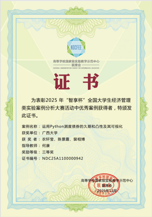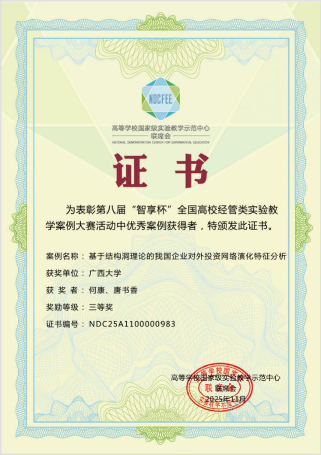 近日,由高等学校国家级实验教学示范中心联席会经济与管理学科组、全国高校财经慕课联盟联合主办,厦门大学经济学院等单位承办的2025年“智享杯”全国高校经管类实验教学案例大赛全国总决赛及2025年“智享杯”全国大学生经济管理类实验案例分析大赛全国总决赛在厦门圆满落幕。我院何康、唐书香教师完成的《基于结构洞理论的我国企业对外投资网络演化特征分析》案例,凭借精巧的案例设计与精彩的现场发挥,荣获教师组三等奖;2025级金融专硕1班农轩莹、陈景露,金融本科232班裴相博同学组成的团队,在何康老师指导下,以《运用Python测度债券的久期和凸性及其可视化》为案例,将技术工具与专业充分融合,荣获学生组三等奖。这些奖项的获取,充分展现了我院师生在实验案例中的深入研究和独到思考。