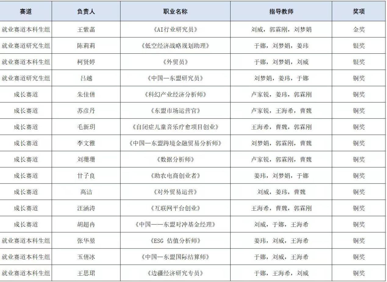 2025年12月7日,第三届全国大学生职业规划大赛广西大学选拔赛圆满收官。我院学子不负众望、奋勇争先,最终斩获1项金奖、2项银奖、13项铜奖,其中王紫菡同学获得“就业赛道本科生组”金奖,陈莉莉同学获得“就业赛道研究生组”银奖,柯贤婷同学获得“就业赛道本科生组”银奖,吕越同学获得“就业赛道研究生组”铜奖,张华堃、玉倩冰、王思珺等三位同学获得“就业赛道本科生组”铜奖,朱佳倩、苏彦丹、毛新玥、李文雅、刘珊珊、甘子良、高洁、汪涵涛、胡超冉等九位同学获得“成长赛道本科生组”铜奖,充分展现了我院学子扎实的专业素养与清晰的职业规划能力,用实力彰显了青春风采。