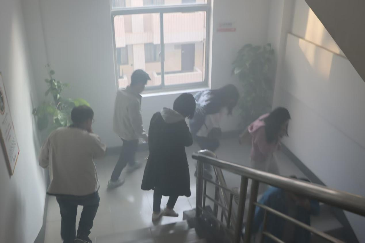 随后进入疏散演练环节。负责人模拟火灾发生后,楼内烟雾渐起的场景,师生迅速反应,用湿毛巾捂住口鼻,在引导人员的指挥下,保持低姿态,沿疏散通道有序、快速撤离至室外安全集结点。