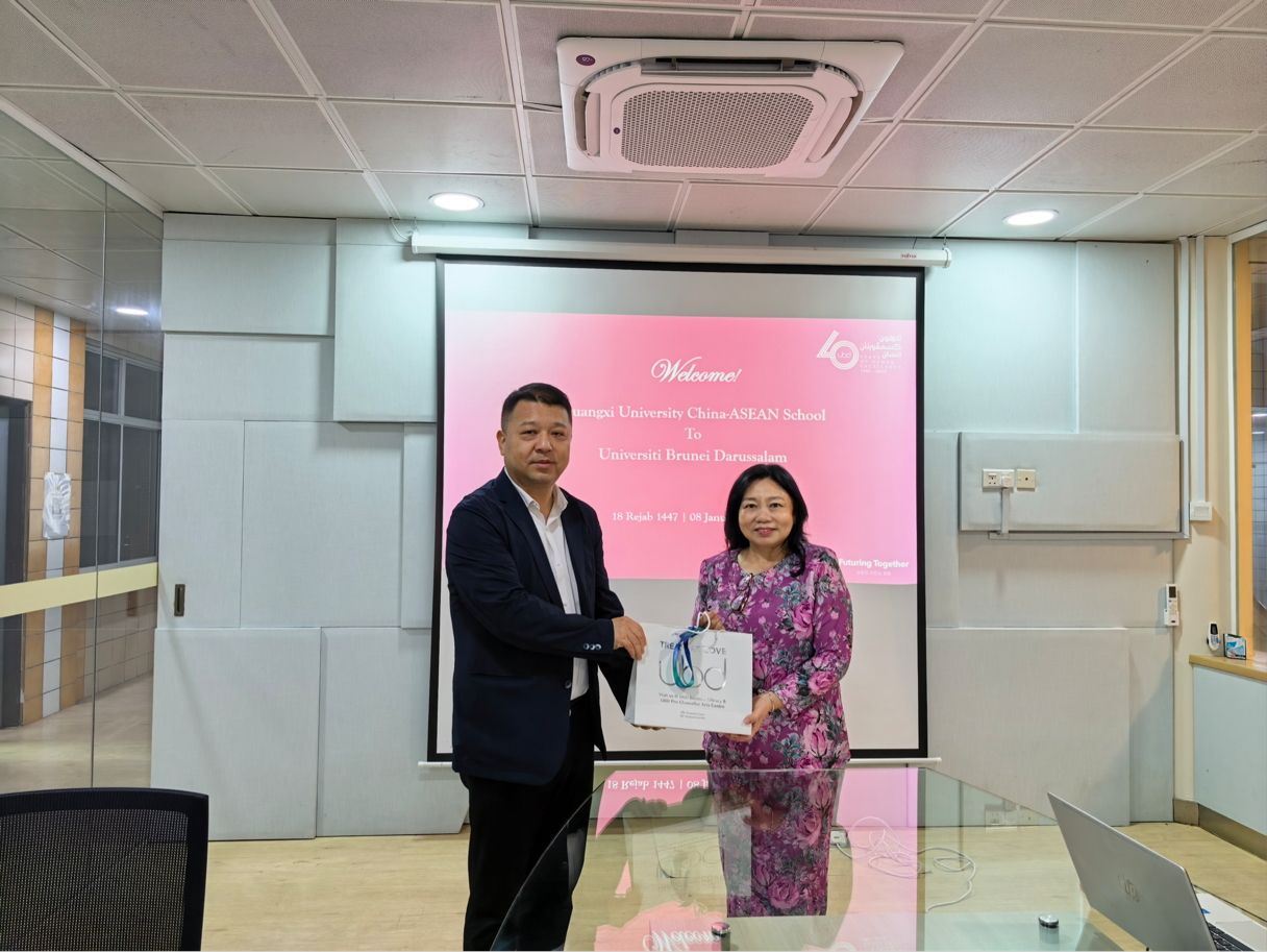 1月8日上午,调研团访问文莱大学商业与经济学院(School of Business and Economics,Universiti Brunei Darussalam),与文莱大学副校长张秀燕(Joyce Teo Siew Yean)博士、商业与经济学院院长瓦尔达・阿齐玛・苏玛尔迪(Wardah Azimah Sumardi)博士、学术与学生事务副院长艾哈迈德・卢特菲・阿卜杜勒・拉扎克(Ahmad Lutfi Abdul Razak)博士、研究创新与可持续发展副院长西蒂・法蒂玛瓦蒂・佩欣・达图・穆萨(Siti Fatimahwati Pehin Dato Musa)博士等进行座谈交流。姜玮从学院服务“中国—东盟命运共同体建设”的国际合作需求出发,阐述了学院在跨境经贸、区域金融等特色领域的学科布局。他表明,此次与文莱大学的对话,是学院深耕东盟国别研究、精准对接合作方需求的重要实践。瓦尔达・阿齐玛・苏玛尔迪院长全面介绍了文莱大学商业与经济学院的学科体系、ACCA免考认证优势及“全球探索”等特色学生项目,艾哈迈德・卢特菲・阿卜杜勒・拉扎克副院长与西蒂・法蒂玛瓦蒂・佩欣・达图・穆萨副院长则分别就教学管理、科研创新与合作机制进行了说明。针对学生联合培养、科研协同攻关及学者互访机制等共同关切的议题,双方深入探讨交换意见,并就推动短期访学项目、在物流与供应链管理及数字经济等领域启动联合研究、共建学者互访与学术研讨平台等相关议题达成积极共识。双方均表示,深化两校间的务实合作,有助于共同培养面向东盟的国际化人才,产出高质量区域研究成果,为深化中文教育合作与人文交流注入新动能。