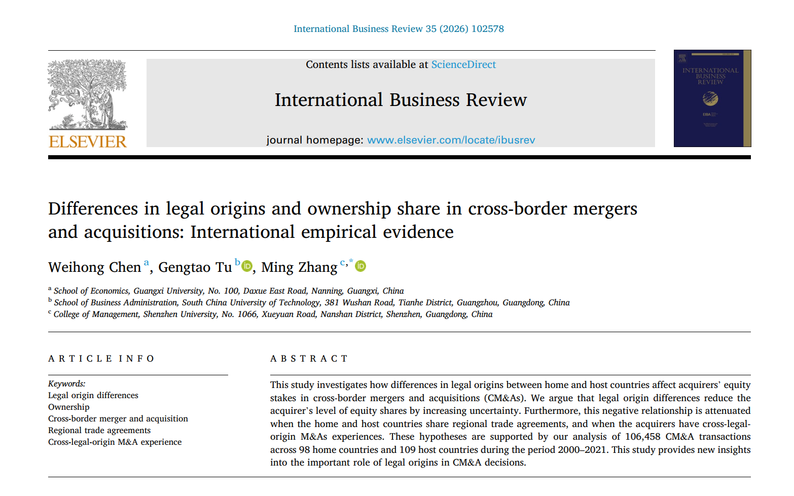 近日,我院陈伟宏副教授与2022级应用经济学专业(国际贸易方向)硕士研究生涂耿滔以及深圳大学张明副教授合作的论文“Differences in legal origins and ownership share in cross-border mergers and acquisitions: International empirical evidence”在《International Business Review》期刊2026年第4期正式出版。陈伟宏副教授为论文第一作者,张明副教授为论文通讯作者。