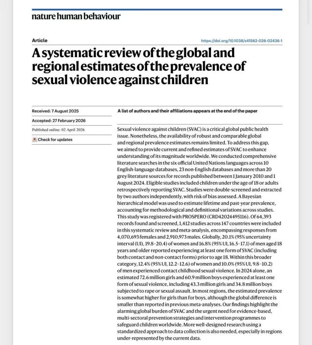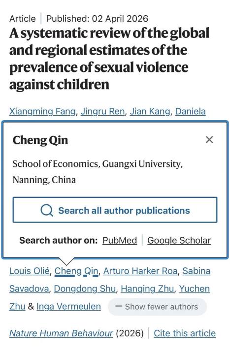 近日,我院教师覃诚合作论文“A systematic review of the global and regional estimates of the prevalence of sexual violence against children”在国际顶级学术期刊《Nature Human Behaviour》上正式发表,论文围绕全球和区域层面儿童相关公共卫生问题展开,由中国农业大学方向明教授担任第一作者,研究团队汇聚了来自世界卫生组织,中国农业大学、北京大学、广西大学,美国疾控中心、密歇根大学,英国爱丁堡大学等15个国际机构的30余位学者。该研究是世界卫生组织全球研究项目的重要成果之一,相关成果在经各国政府确认后,将有望成为世界卫生组织及其他联合国机构的重要官方数据来源,为全球政策制定提供关键依据。