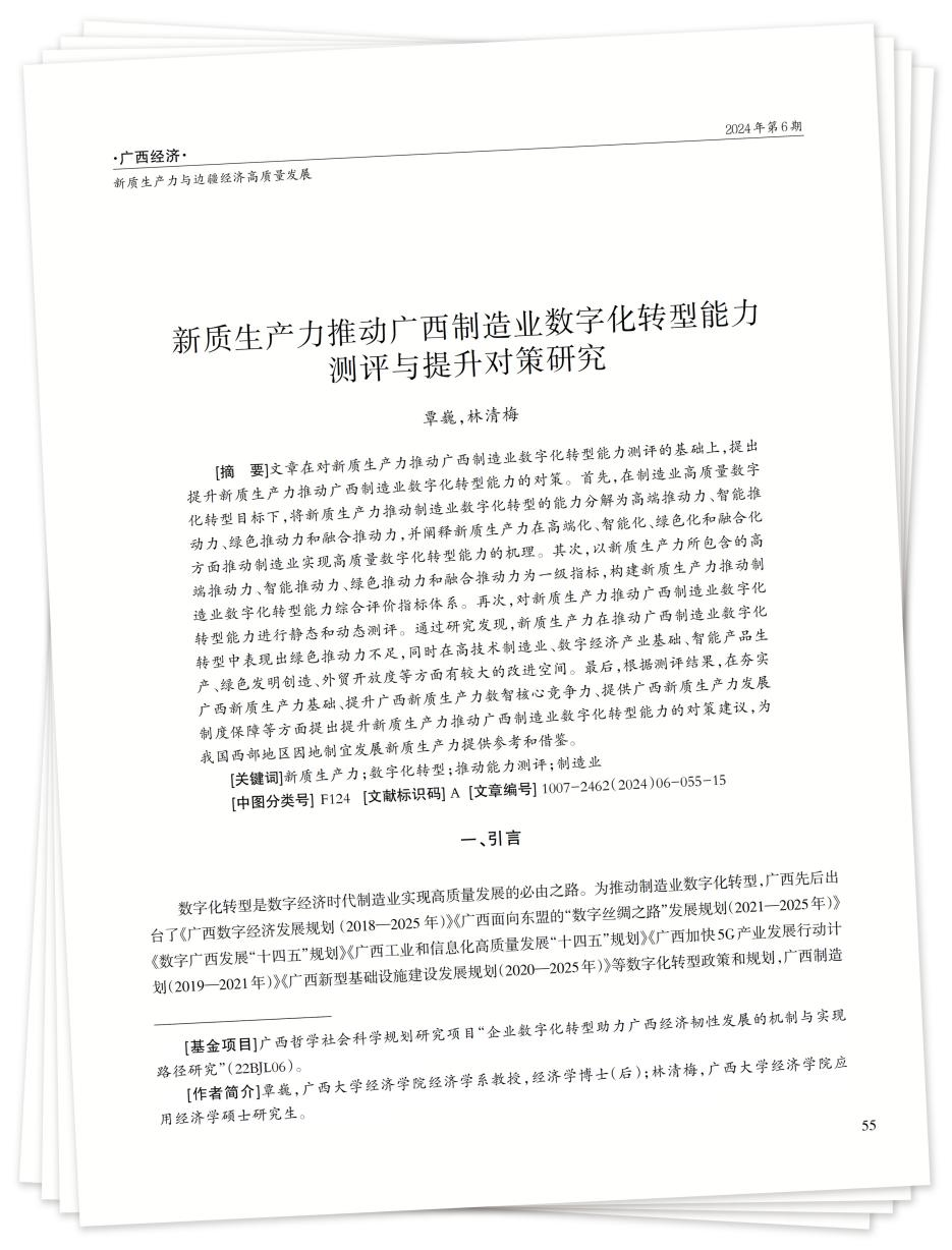 [摘 要]文章在对新质生产力推动广西制造业数字化转型能力测评的基础上,提出提升新质生产力推动广西制造业数字化转型能力的对策。首先,在制造业高质量数字化转型目标下,将新质生产力推动制造业数字化转型的能力分解为高端推动力、智能推动力、绿色推动力和融合推动力,并阐释新质生产力在高端化、智能化、绿色化和融合化方面推动制造业实现高质量数字化转型能力的机理。其次,以新质生产力所包含的高端推动力、智能推动力、绿色推动力和融合推动力为一级指标,构建新质生产力推动制造业数字化转型能力综合评价指标体系。再次,对新质生产力推动广西制造业数字化转型能力进行静态和动态测评。通过研究发现,新质生产力在推动广西制造业数字化转型中表现出绿色推动力不足,同时在高技术制造业、数字经济产业基础、智能产品生产、绿色发明创造、外贸开放度等方面有较大的改进空间。最后,根据测评结果,在夯实广西新质生产力基础、提升广西新质生产力数智核心竞争力、提供广西新质生产力发展制度保障等方面提出提升新质生产力推动广西制造业数字化转型能力的对策建议,为我国西部地区因地制宜发展新质生产力提供参考和借鉴。