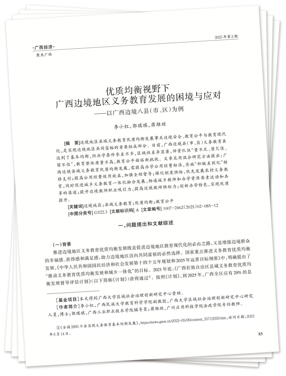 [摘 要]边境地区县域义务教育优质均衡发展事关边境安全、教育公平与教育现代化,是实现边境地区共同富裕的重要组成部分。目前,广西边境县(市、区)义务教育虽达到了基本均衡,但办学条件参差不齐,区域性差异显著,师资队伍“量不足、质欠佳、留不住”,教育整体质量不高,教育公平面临新挑战。文章采用混合研究方法提出:广西边境县域义务教育优质均衡发展,需提高办学公用经费标准,实施“积极差别化”转移支付;提高公用经费使用效益,加强全程督导;强化制度供给,优先发展农村义务教育,同时促进城乡义务教育一体化融合发展,畅通城乡教师和办学资源要素流动和共享的渠道;提升边境教师职业吸引力,提高边境教师供给力;创新办学特色,实现优质提升。